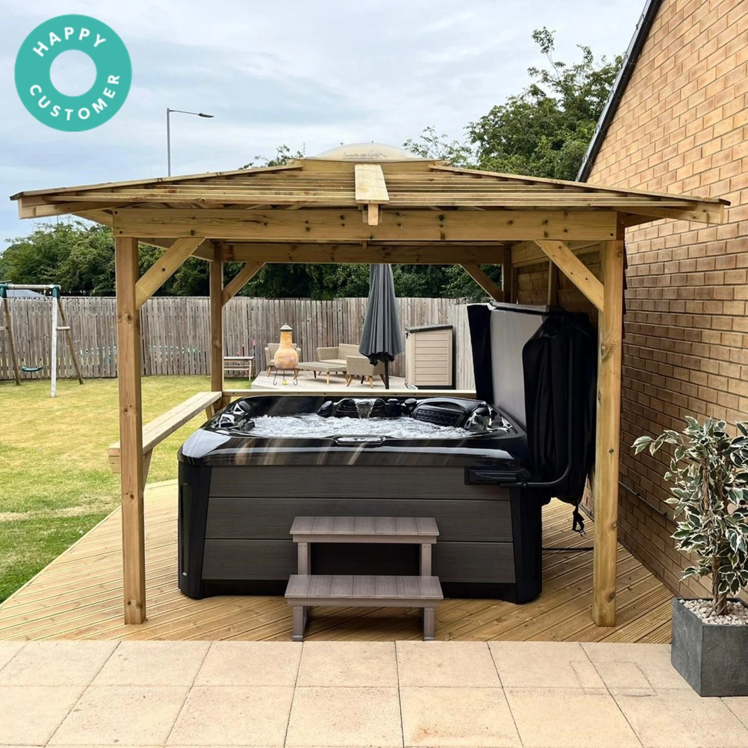 Wooden gazebos are an ideal choice for a hot tub shelter. They blend in seamlessly into your garden and allow for an open feel while protecting from the elements. Gazebos will enhance your relaxation experience in your own hot tub haven!